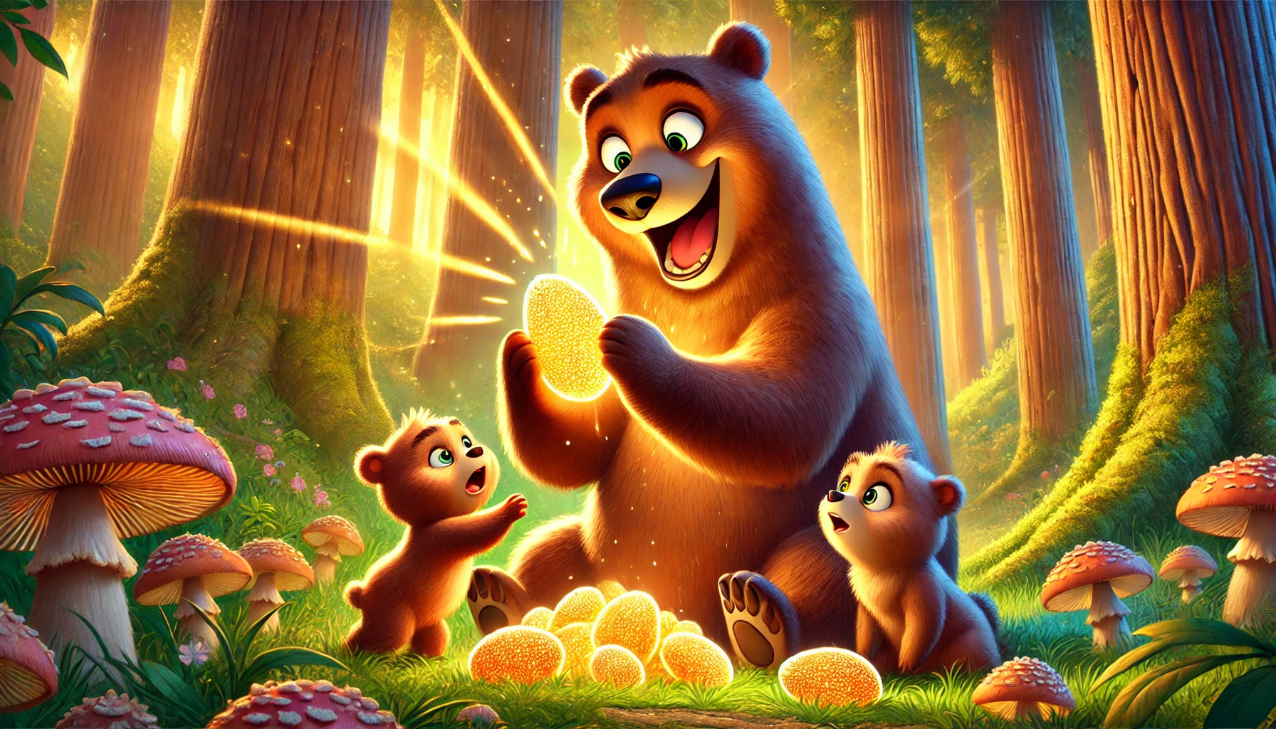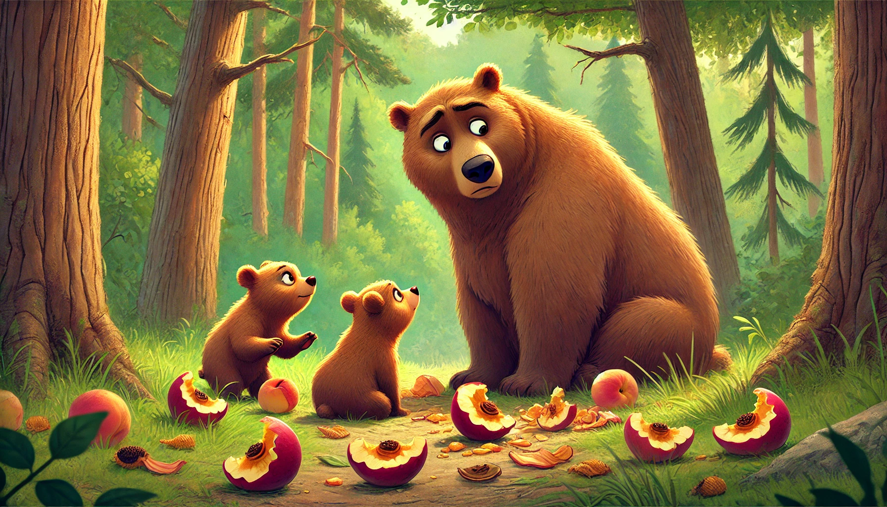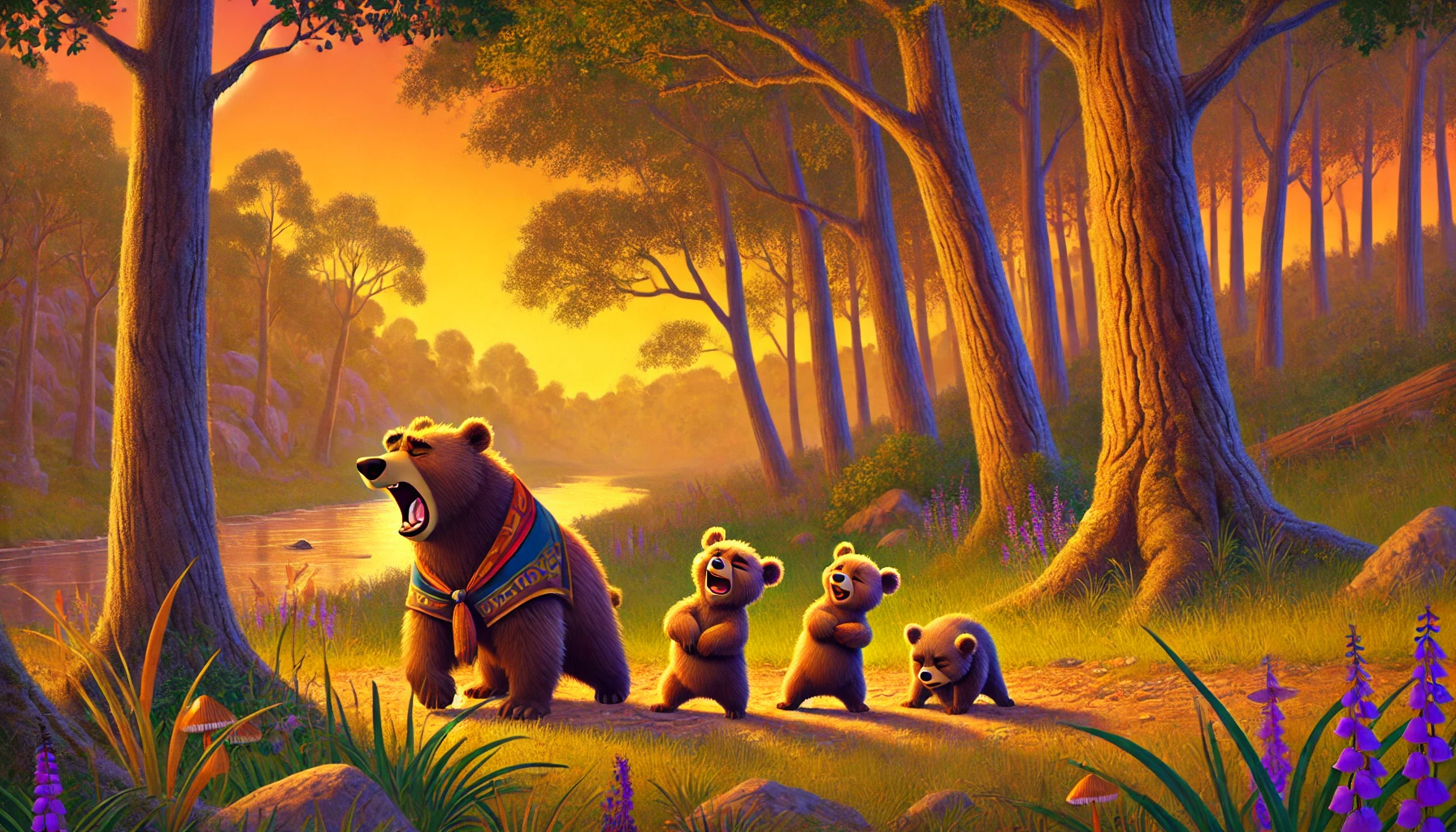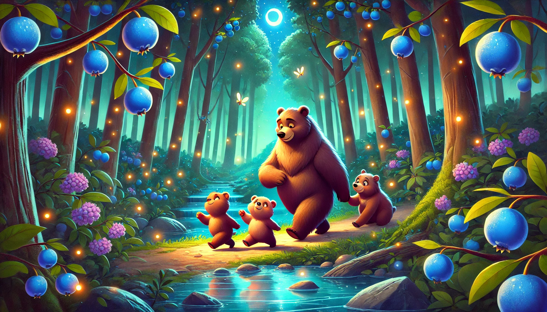 En el Bosque de Pi, vivía una familia de osos: papá oso, mamá osa, y sus tres pequeños. Cada vez que papá oso regresaba a casa, los hijos corrían a abrazarlo, llenando el ambiente de alegría. Juntos, solían salir a pasear por los senderos del bosque, entre cerezas celestes, luciérnagas danzantes, claros de luna y arroyos de agua cristalina.